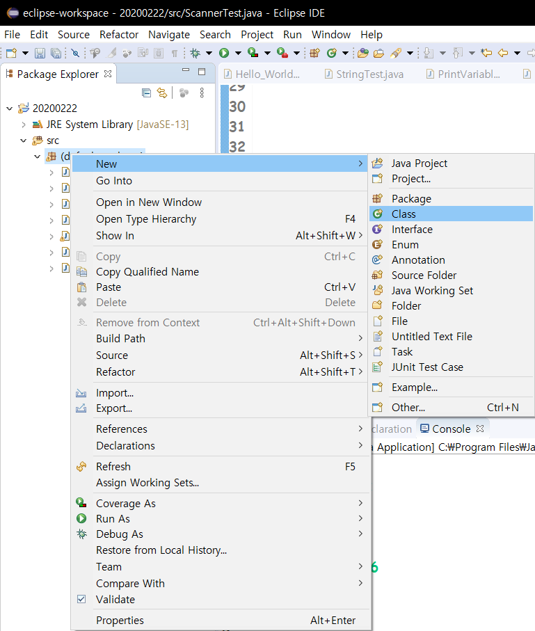 클래스 생성: 패키지 마우스 오른쪽 클릭후 - New - Class