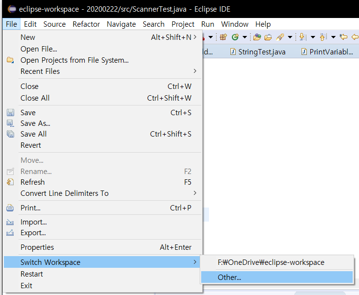 Workspace 경로 바꾸기: File - Switch Workspace - Other...