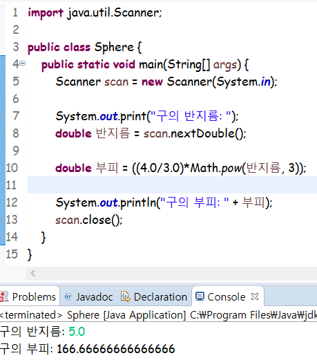 단, 구의 반지름은 실수(소수점이 있는 수)로 입력되며 출력도 모두 실수형으로 하여야 한다.