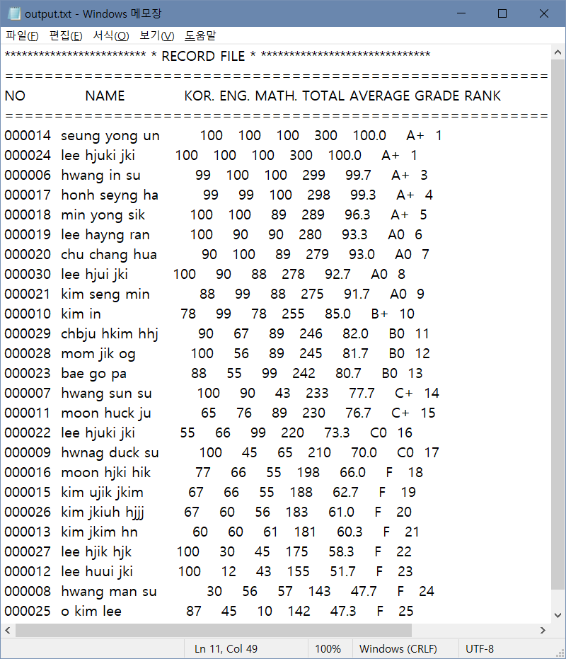 같은 폴더의 output.txt로 출력하는 구조체 포인터를 이용하는 C 프로그램